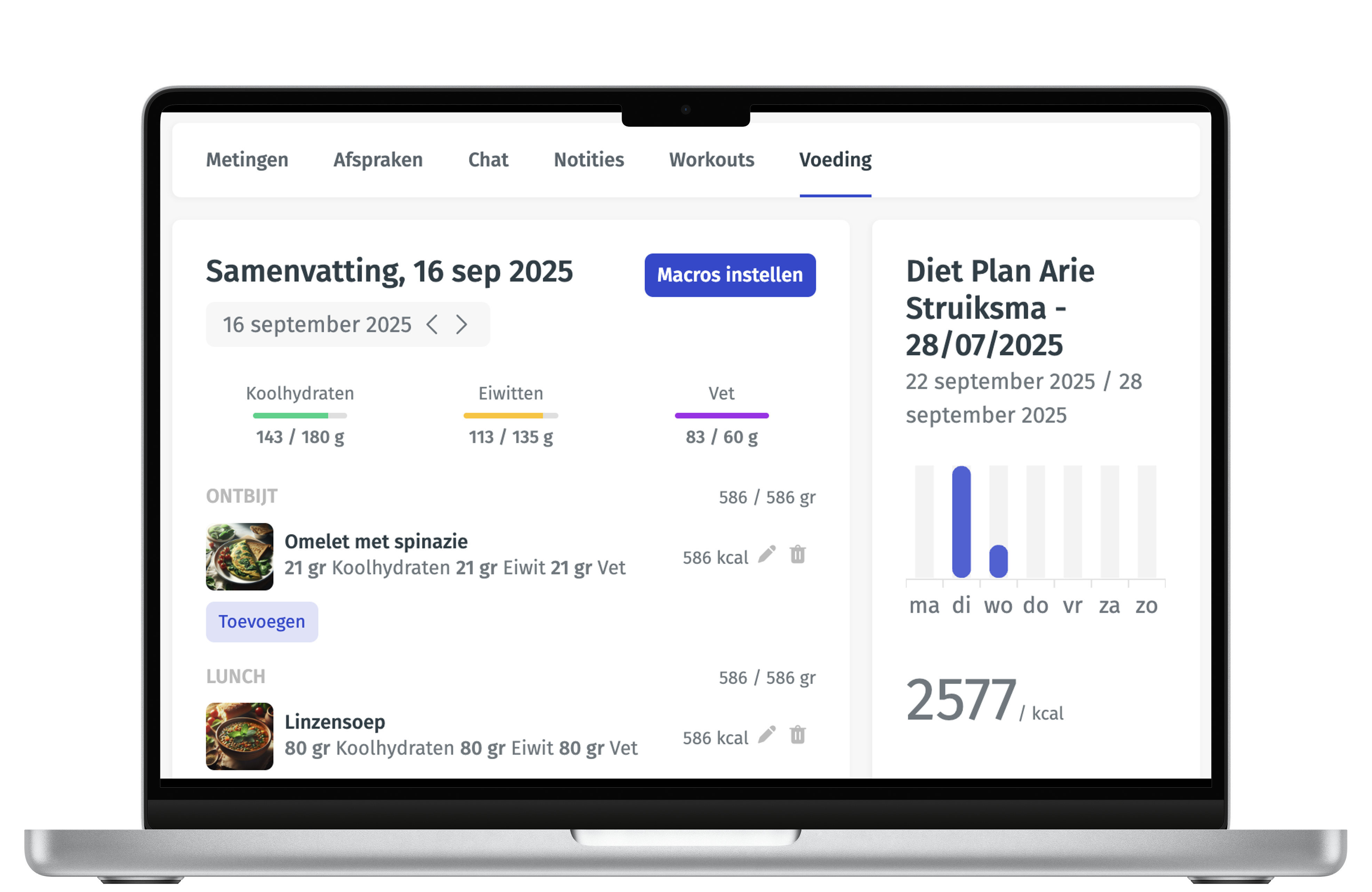 Coaches zien de dagelijkse macro’s en maaltijdkeuzes van leden in één overzicht.