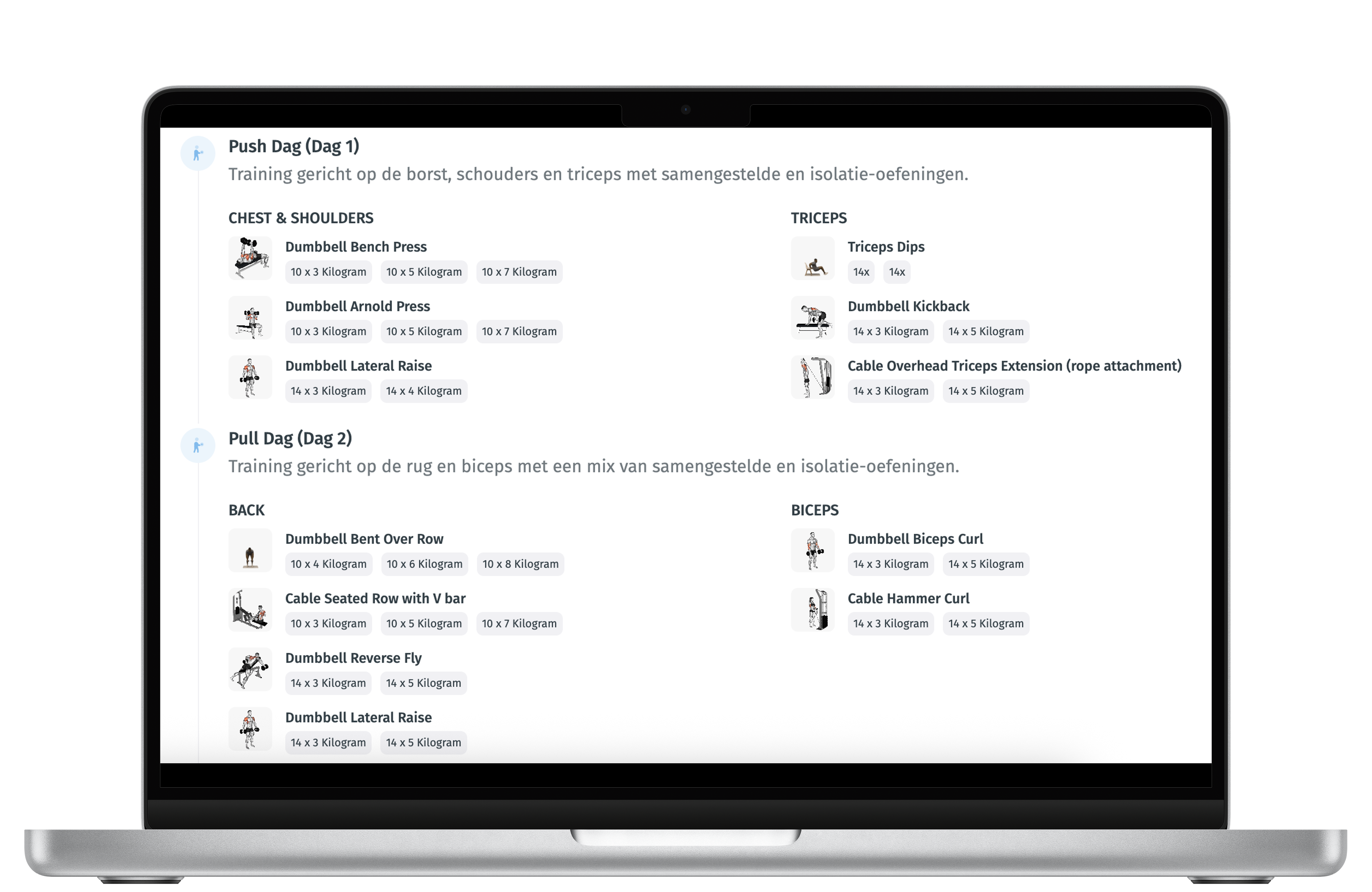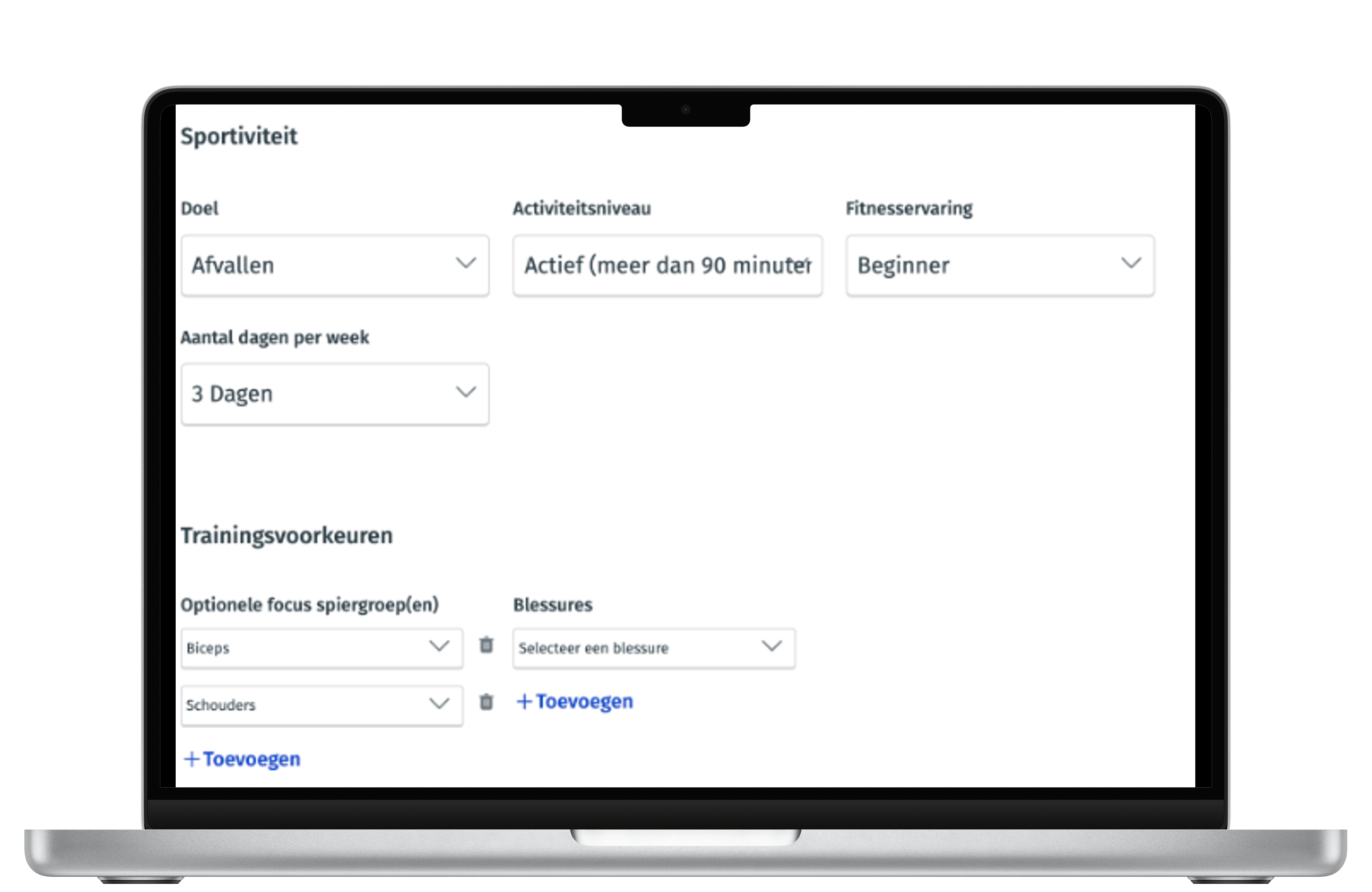 Met de AI Fitnessmodule stel je razendsnel persoonlijke trainingsschema’s op, volledig afgestemd op de doelen, ervaring en beschikbare apparatuur van jouw leden.